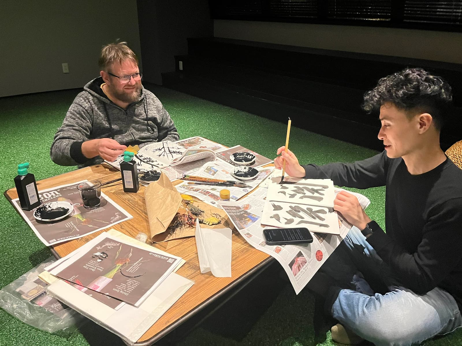 是由長期旅居國外的日本人 Yuki,教導大家。 開始是很單純的一筆、一豎,後來變成自由發揮,大家也玩得很開心。